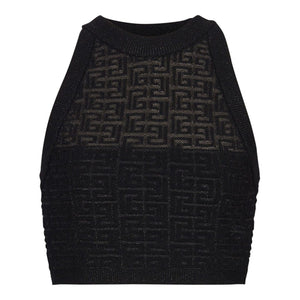 black open knit signature 4G motif metallic threading halterneck sleeveless cropped straight hem Monogram halterneck top Size and Fit - This piece fits true to size. We recommend you get your regular size. Model is 1,75m / 5ft 8in wearing size 36 (FR)