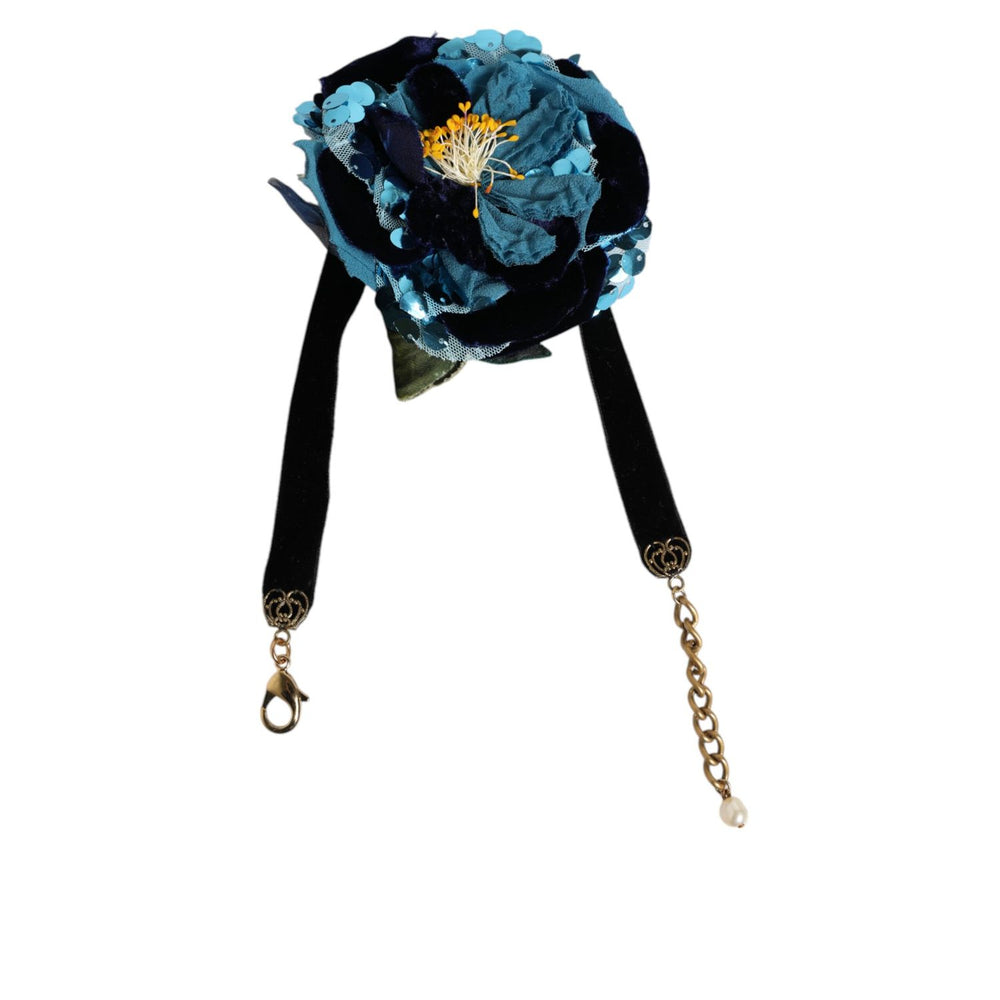 Gorgeous brand new, 100% Authentic Dolce & Gabbana statement necklace. This stunning choker-style necklace features a bold oversized floral appliqué centerpiece in rich shades of blue, detailed with sequins, layered fabric petals, and intricate embroidery. The adjustable black velvet band adds a luxurious contrast, finished with gold-tone metal chain extenders and a lobster clasp for a secure fit. A delicate faux pearl drop at the back adds an elegant finishing touch.