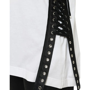 Gorgeous brand new, 100% Authentic Dolce & Gabbana women’s T-shirt, crafted from 100% cotton. Featuring a striking “2000 Fashion Moment” front print, iconic gold DG logo detail, and lace-up eyelet sides, this piece perfectly blends casual comfort with statement fashion.