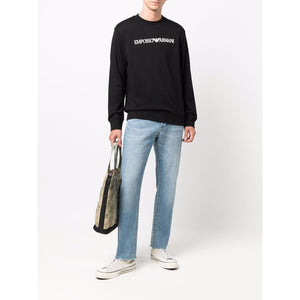 Black/white modal-cotton blend logo-print crew-neck sweatshirt from EMPORIO ARMANI featuring jersey fleece, logo print to the front, crew neck, long sleeves and straight hem. Logo cotton sweatshirt Size and Fit - This piece fits true to size. We recommend you get your regular size. Model is 1,84m / 6ft 1in wearing size M