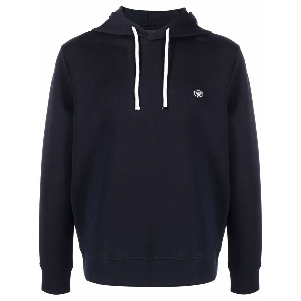 Navy cotton-blend long-sleeved logo patch hoodie from EMPORIO ARMANI featuring ribbed detailing, logo patch at the chest, drawstring hood and long sleeves. Logo cotton hoodie Size and Fit - This piece fits true to size. We recommend you get your regular size. Model is 1,84m / 6ft 1in wearing size M