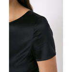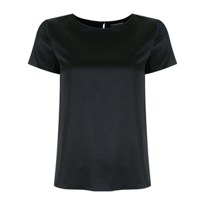 Blue stretch-silk scoop neck T-shirt from EMPORIO ARMANI featuring scoop neck, short sleeves, straight hem and stretch-design. Silk top Size and Fit - This piece fits true to size. We recommend you get your regular size. Model is 1,75m / 5ft 8in wearing size 40 (IT)