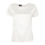 White stretch-silk round-neck stretch silk T-shirt from EMPORIO ARMANI featuring round neck, short sleeves, adjustable fit and straight hem. Silk top Size and Fit - This piece fits true to size. We recommend you get your regular size. Model is 1,75m / 5ft 8in wearing size 40 (IT)