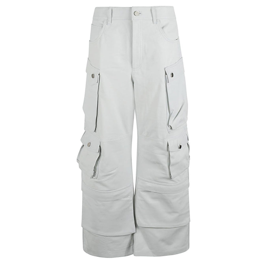 White cargo trousers, side pockets on Entmbi Figure, zip and button closure, currency pocket, pocket closure with buttons. Leather cargo pants Size and Fit - This piece fits true to size. We recommend you get your regular size. Model is 1,75m / 5ft 8in wearing size 40 (IT)