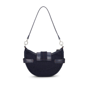 navy blue recycled cotton denim embossed logo to the front front buckle fastening top zip fastening detachable shoulder strap adjustable detachable shoulder strap main compartment This piece comes complete with a protective dust bag. This item is made from at least 50% recycled or upcycled materials. For recycled synthetic clothing products, we highly recommend using a microfibre-catching washing bag to ensure that no microplastics that can pollute water are released in the process. We've partnered with Good On You — an independent agency that rates how brands perform in relation to their impact on the planet, people and animals, with a multi-criteria rating simplified to a five points scale. In order to be awarded our conscious label, larger brands need to score a minimum of four out of five ('Good'), while smaller brands must score at least three out of five ('It's A Start'). This item comes from a brand rated three out of five ('It's A Start') by Good on You at the time it was adde Bucky small denim crossbody bag Size and Fit - Width 9,06 in / 23 cm Height 6,5 in / 16,5 cm Depth 2,36 in / 6 cm Strap 7,87 in / 20 cm