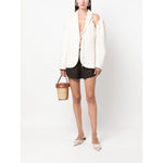La veste Galliga asymmetric blazer from Jacquemus featuring off-white, linen blend, notched lapels, cut-out detailing, long sleeves, gold-tone hardware, two side welt pockets, buttoned central rear vent, adjustable attached strap and adjustable D-ring fasteners. This item contains at least 50% materials which are certified or widely recognised as having a lower environmental impact through production and/or manufacturing processes that reduce water consumption and the use of harmful chemicals, or re-use by-products of the production process.. Learn more about what makes a product Conscious on our Conscious Criteria page. La Veste Galliga blazer jacket Size and Fit - This piece fits true to size. We recommend you get your regular size. Model is 1,75m / 5ft 8in wearing size 36 (FR)