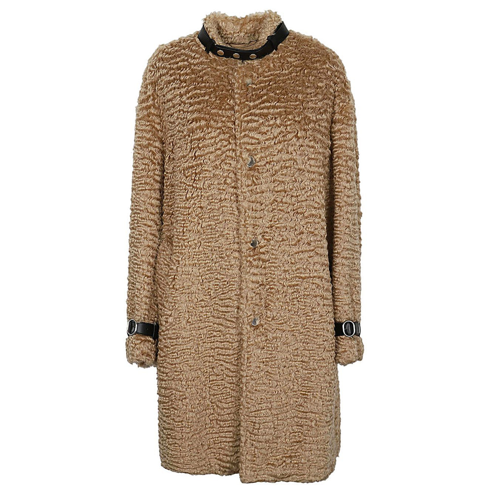 Long beige coat, solid colour, long sleeves with straps on the wrists, mandarin neckline with belt, front button closure, back vent, internal lining. Wool coat Size and Fit - This piece fits true to size. We recommend you get your regular size. Model is 1,75m / 5ft 8in wearing size 34 (DE)