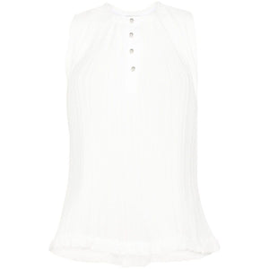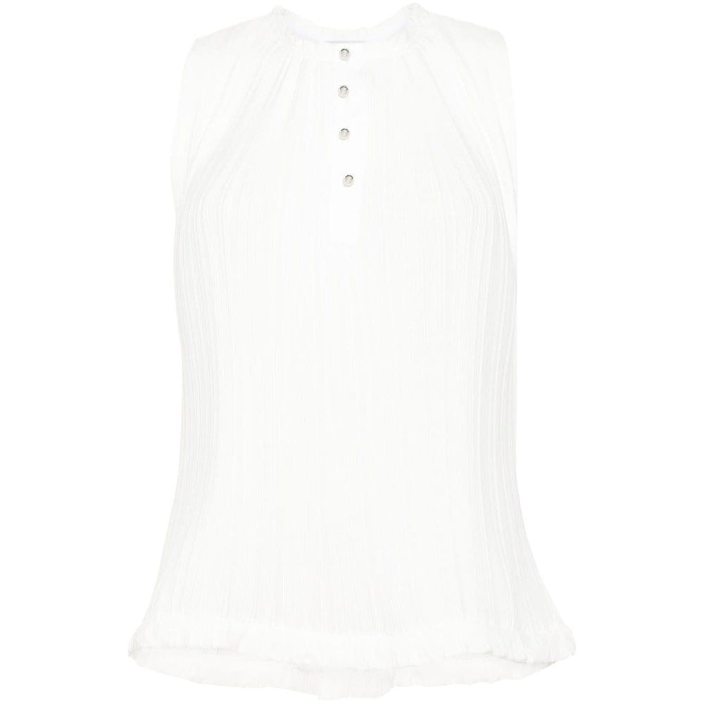 white crepe de chine plissé effect round neck with raw-cut edge sleeveless ruffle hem silver-tone buttons short front button fastening Pleated sleeveless top Size and Fit - This piece fits true to size. We recommend you get your regular size. Model is 1,75m / 5ft 8in wearing size 36 (FR)