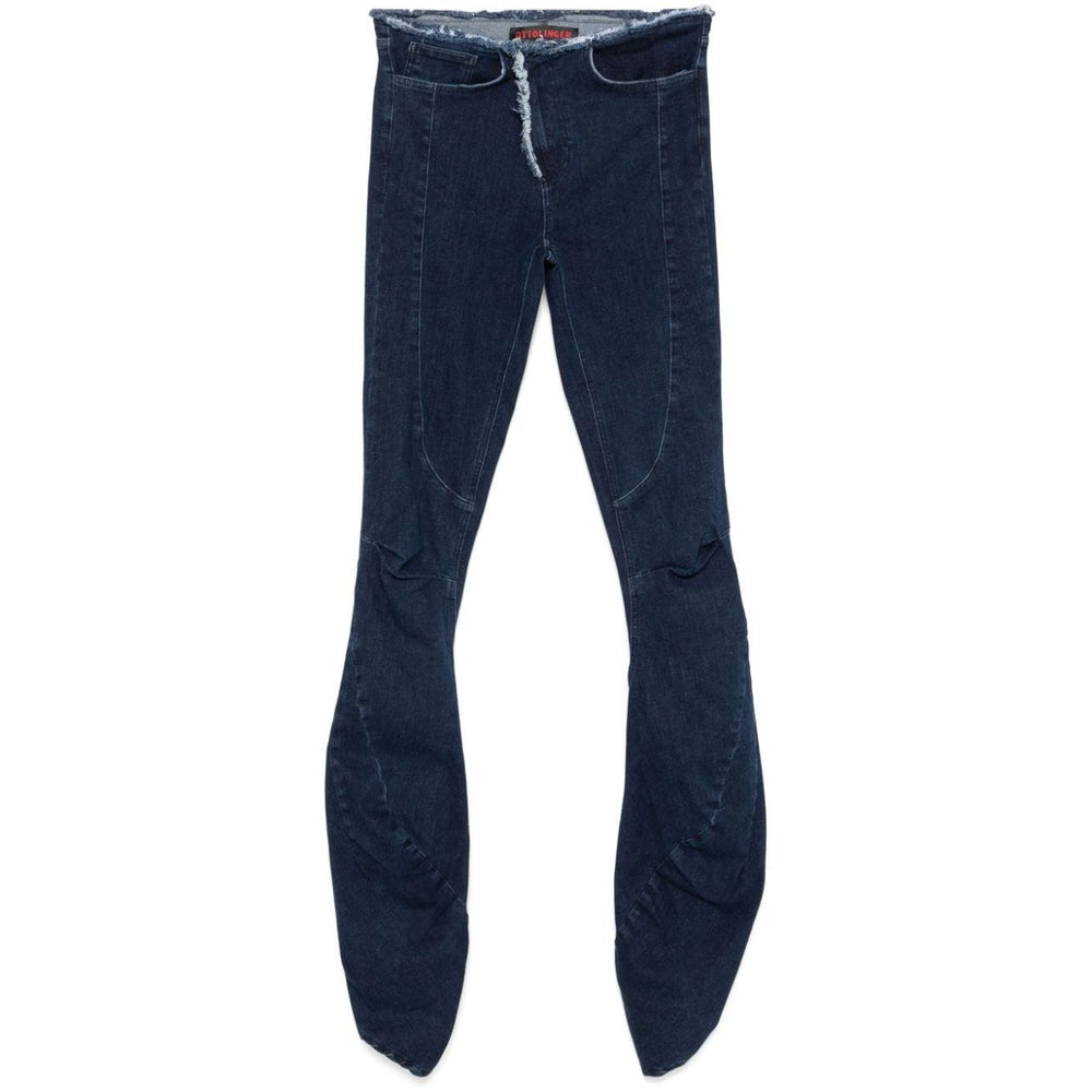 indigo blue denim raw edge draped design hook and zip fly fastening seam detailing classic five pockets long length slim cut leg bootcut hem Frayed-edge denim jeans Size and Fit - This piece fits true to size. We recommend you get your regular size. Model is 1,75m / 5ft 8in wearing size S