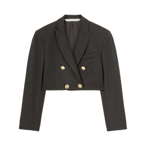cropped double-breasted blazer from PALM ANGELS featuring black, virgin wool blend, peak lapels, chest welt pocket, embossed gold-tone buttons, cropped and straight hem. Cropped blazer Size and Fit - This piece fits true to size. We recommend you get your regular size<br>Model is 1,75m / 5ft 8in wearing size 40 (IT).
