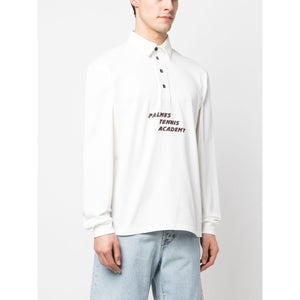 logo-print button-up sweatshirt from Palmes featuring ivory white, organic cotton, logo print to the front, classic collar, front button placket, long sleeves, elasticated cuffs and straight hem. This item is made from at least 50% organic materials.. Learn more about what makes a product Conscious on our Conscious Criteria page. Organic cotton long sleeve shirt Size and Fit - This piece fits true to size. We recommend you get your regular size. Model is 1,84m / 6ft 1in wearing size M
