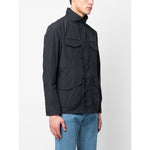 flap-pocket cotton-blend jacket from PEUTEREY featuring logo patch at the sleeve, concealed front fastening, long sleeves, four front flap pockets, navy blue, cotton blend and stand-up collar. Metal blouson jacket Size and Fit - This piece fits true to size. We recommend you get your regular size. Model is 1,84m / 6ft 1in wearing size M