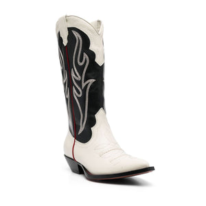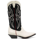 Santa Fe 50mm boots from Sonora featuring black/white, calf leather, decorative stitching, pull-on style, branded leather insole, mid block heel and pointed toe. Embroidered suede western boots Size and Fit - Heel 3,9 in / 10 cm; Platform 0,4 in / 1 cm