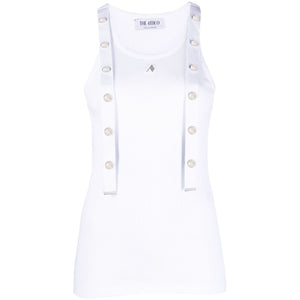 optical white cotton ribbed knit piped-trim detailing silver-tone logo plaque stud embellished strap detailing scoop neck sleeveless straight hem Ribbed cotton tank top Size and Fit - This piece fits true to size. We recommend you get your regular size. Model is 1,75m / 5ft 8in wearing size 40 (IT)