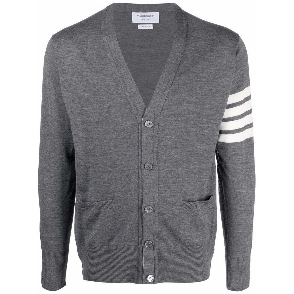 Grey merino 4-Bar knitted cardigan from THOM BROWNE featuring signature 4-Bar stripe, V-neck, front button fastening, long sleeves and buttoned cuffs. 4Bar wool cardigan Size and Fit - This piece fits true to size. We recommend you get your regular size. Model is 1,84m / 6ft 1in wearing size 2 (NUM)