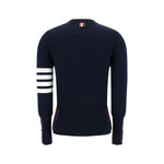 Thom Browne’s virgin wool Sweater is an iconic piece with a clean yet richly tailored design. A classic crew neck combines with a ribbed high hem, featuring practical side buttons that allow you to adjust the slits with discretion and functionality. The cuffs, also ribbed and button-fastened, add a touch of structured elegance. Distinguishing the sweater are the brand’s iconic horizontal bands, positioned on the left arm, which lend instant recognition and a graphic accent typical of the Thom Browne style.