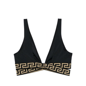 Black/gold colored, stretch design, layered design, signature Greca detail, triangle cup, V-neck, elasticated band. Greca triangle bikini top Size and Fit - This piece fits true to size. We recommend you get your regular size. Model is 1,75m / 5ft 8in wearing size 1 (NUM)
