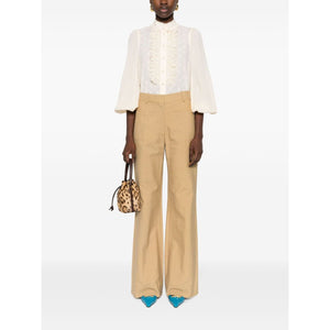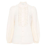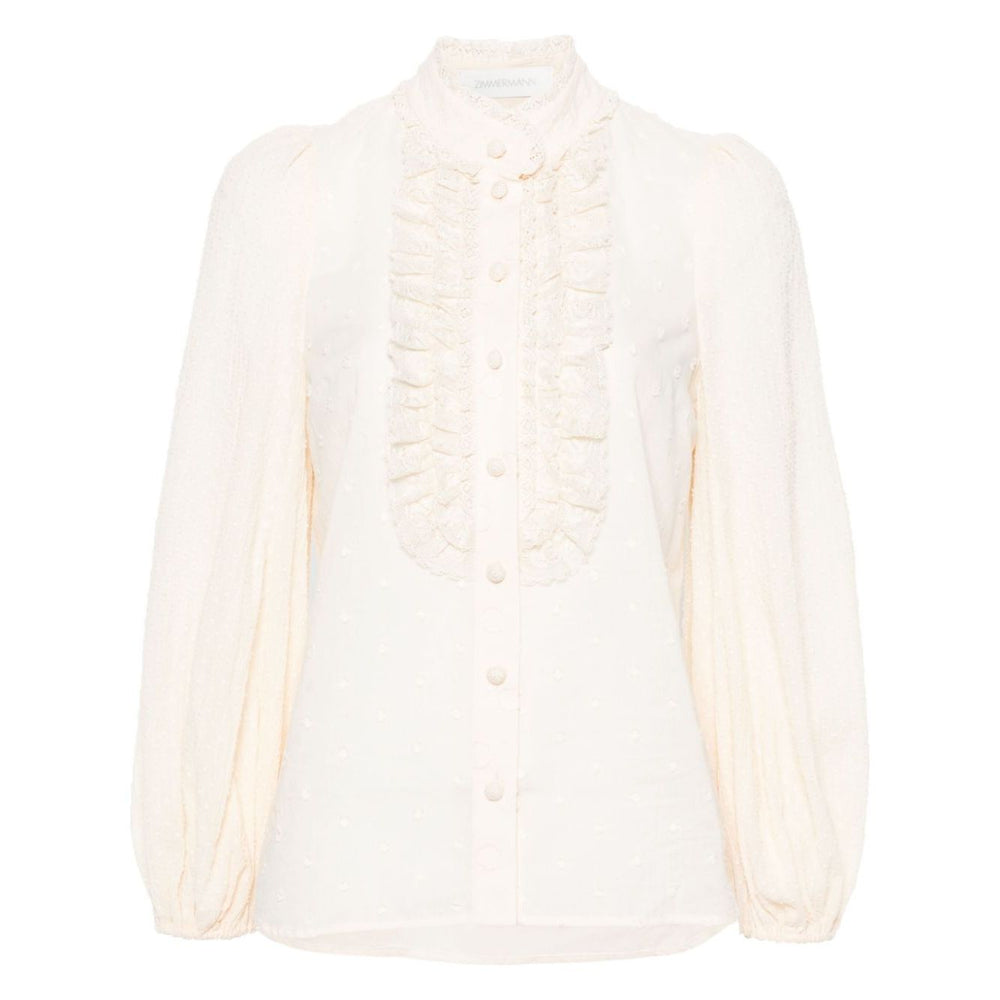 cream white cotton mock neck ruffled detailing polka dot embroidery long sleeves front buckle fastening elasticated cuffs straight hem Cotton blouse Size and Fit - This piece fits true to size. We recommend you get your regular size. Model is 1,75m / 5ft 8in wearing size 1 (NUM)